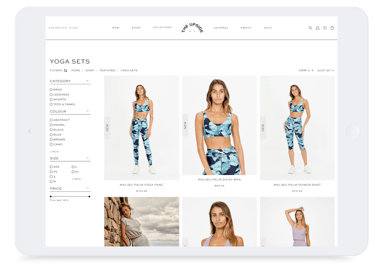 THE UPSIDE sử dụng ứng dụng Searchspring làm công cụ tìm kiếm và bán hàng. Nó cho phép thương hiệu hợp nhất tất cả các danh mục sản phẩm của mình và đặt ra các quy tắc để mọi thứ được quản lý tự động theo các thông số mà công ty đặt trong nền tảng.