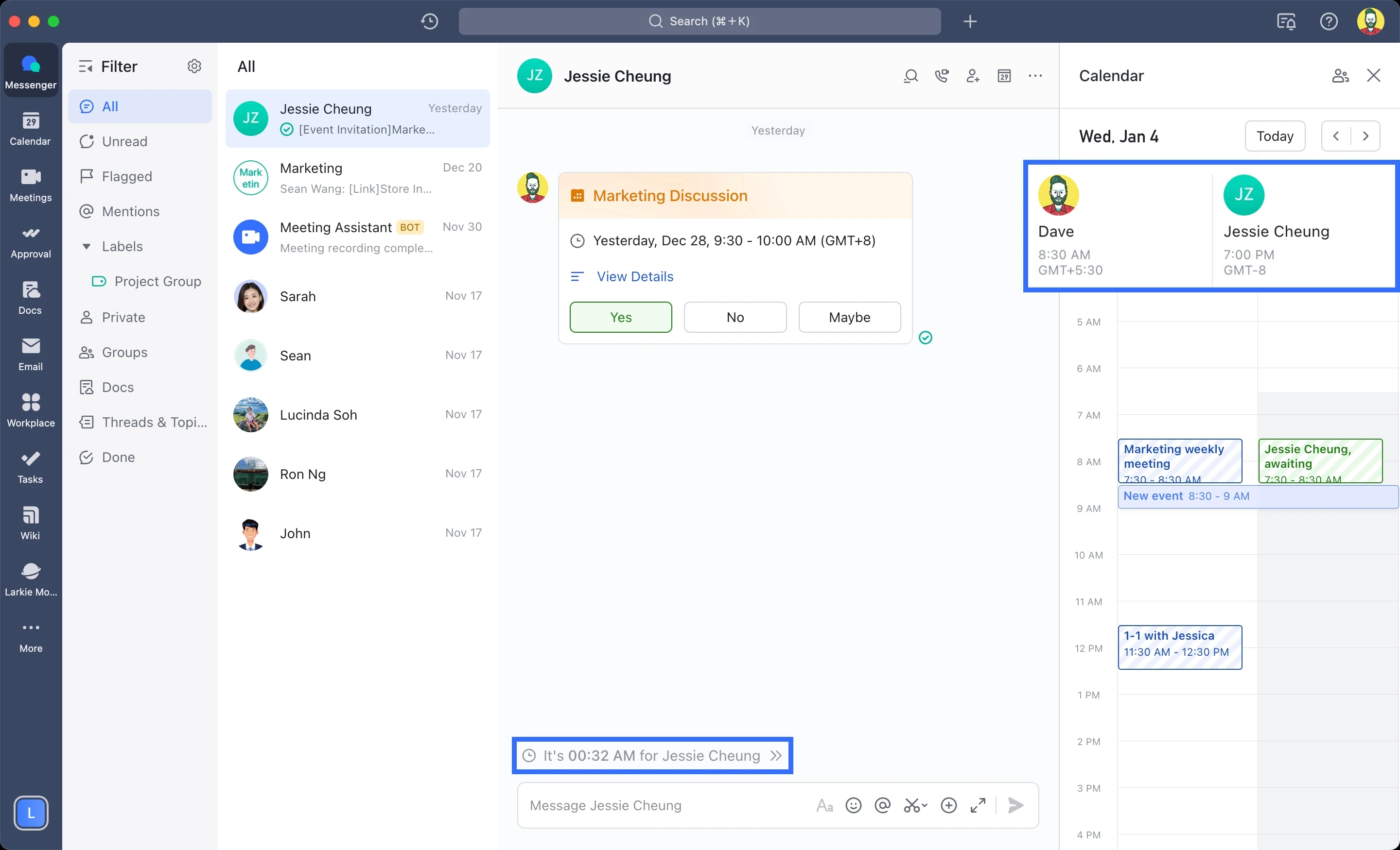 Vì đội ngũ của Xiaomi trải rộng trên nhiều châu lục và múi giờ nên thường rất khó để tìm được thời gian gặp mặt phù hợp với tất cả mọi người. Để giải quyết những thách thức do chênh lệch múi giờ, Xiaomi sử dụng Lark Calendar để tạo điều kiện phối hợp và liên lạc với các nhóm địa phương.