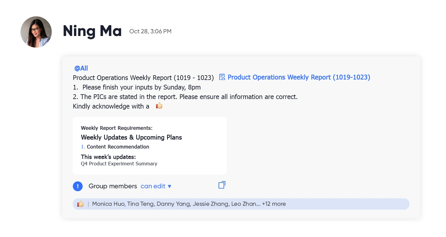 • Trưởng dự án gửi tin nhắn nhóm và Lark Doc để mọi người nhập thông tin đầu vào của họ