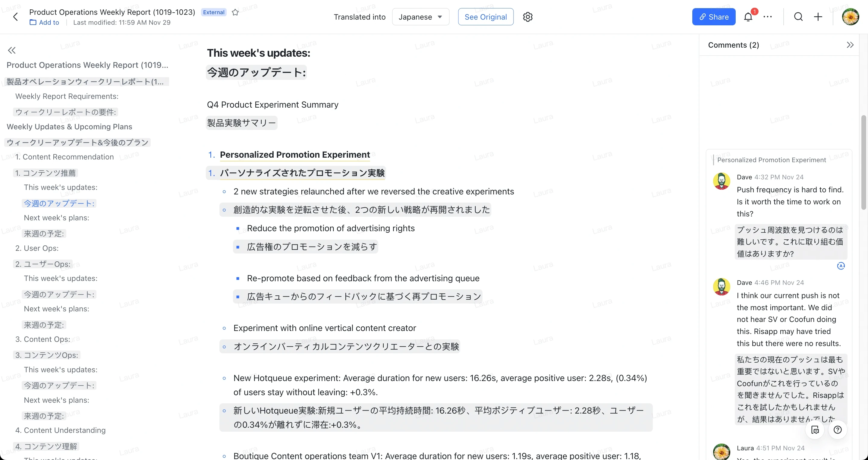 Với Lark Docs, đội ngũ tại Xiaomi đã có thể hợp lý hóa hoạt động giao tiếp và cải thiện năng suất của họ. Vì tất cả các Tài liệu của đều nằm trên đám mây nên chúng luôn là phiên bản mới nhất, loại bỏ sự nhầm lẫn do nhiều phiên bản tạo ra. Chúng cũng có thể dễ dàng truy cập và tìm kiếm trên tất cả các thiết bị. Chức năng bình luận cho phép họ trao đổi thông tin nhanh chóng và theo dõi trong thời gian thực, với các thông báo được gửi trực tiếp đến cuộc trò chuyện của họ.