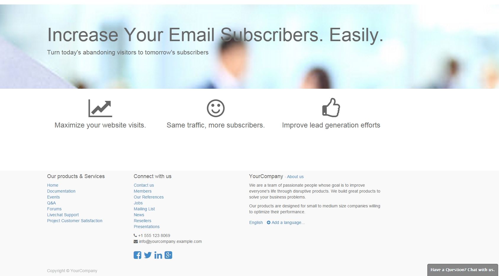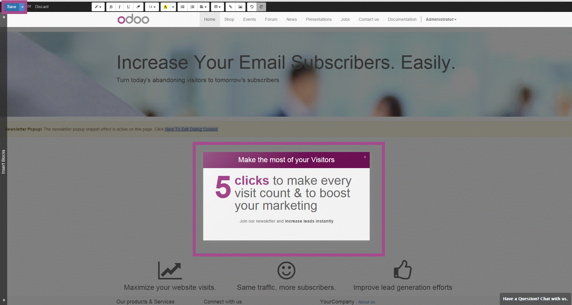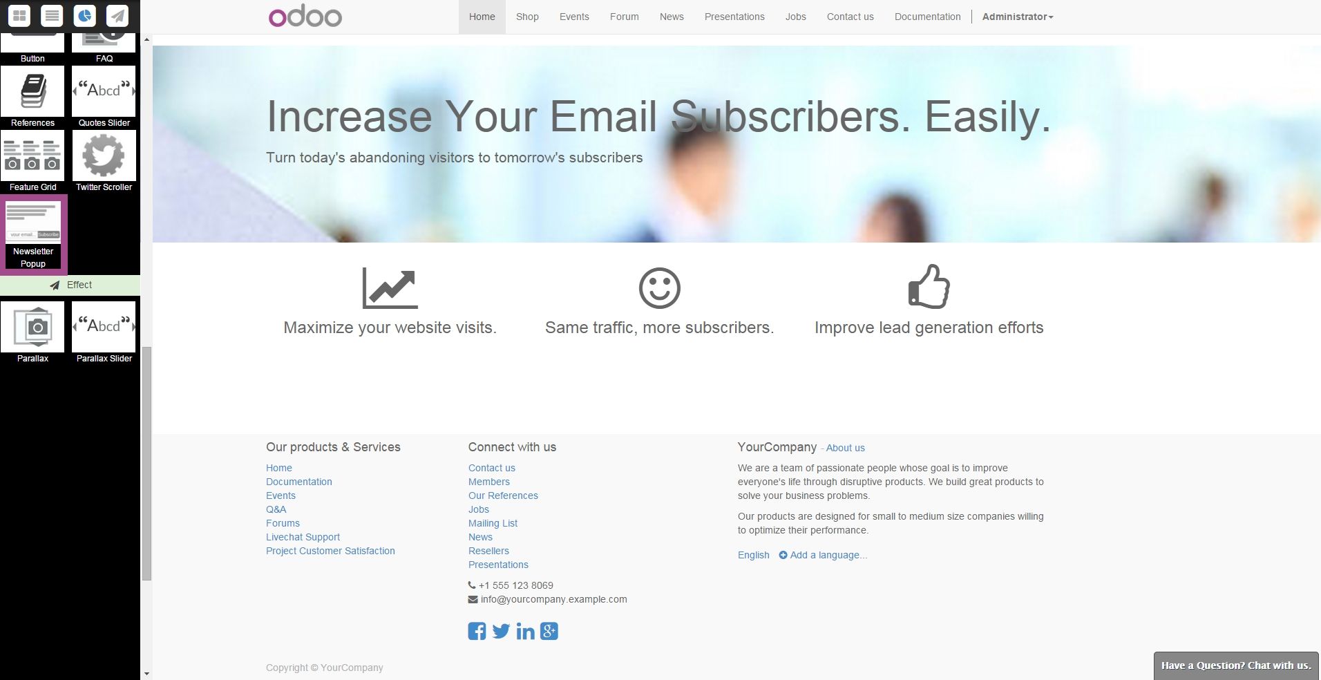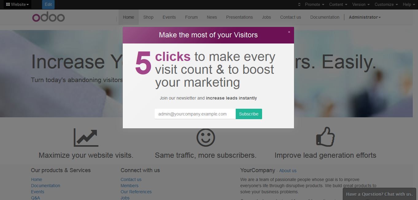Đây là loại công cụ mà Odoo vừa phát triển. Mọi thứ đều xoay quanh mục đích thu hút khách truy cập hành động và tận dụng tối đa sự chú ý của người dùng: chuyển đổi mọi khách truy cập, bao gồm cả khách vãng lai, thành người đăng ký subscriber.