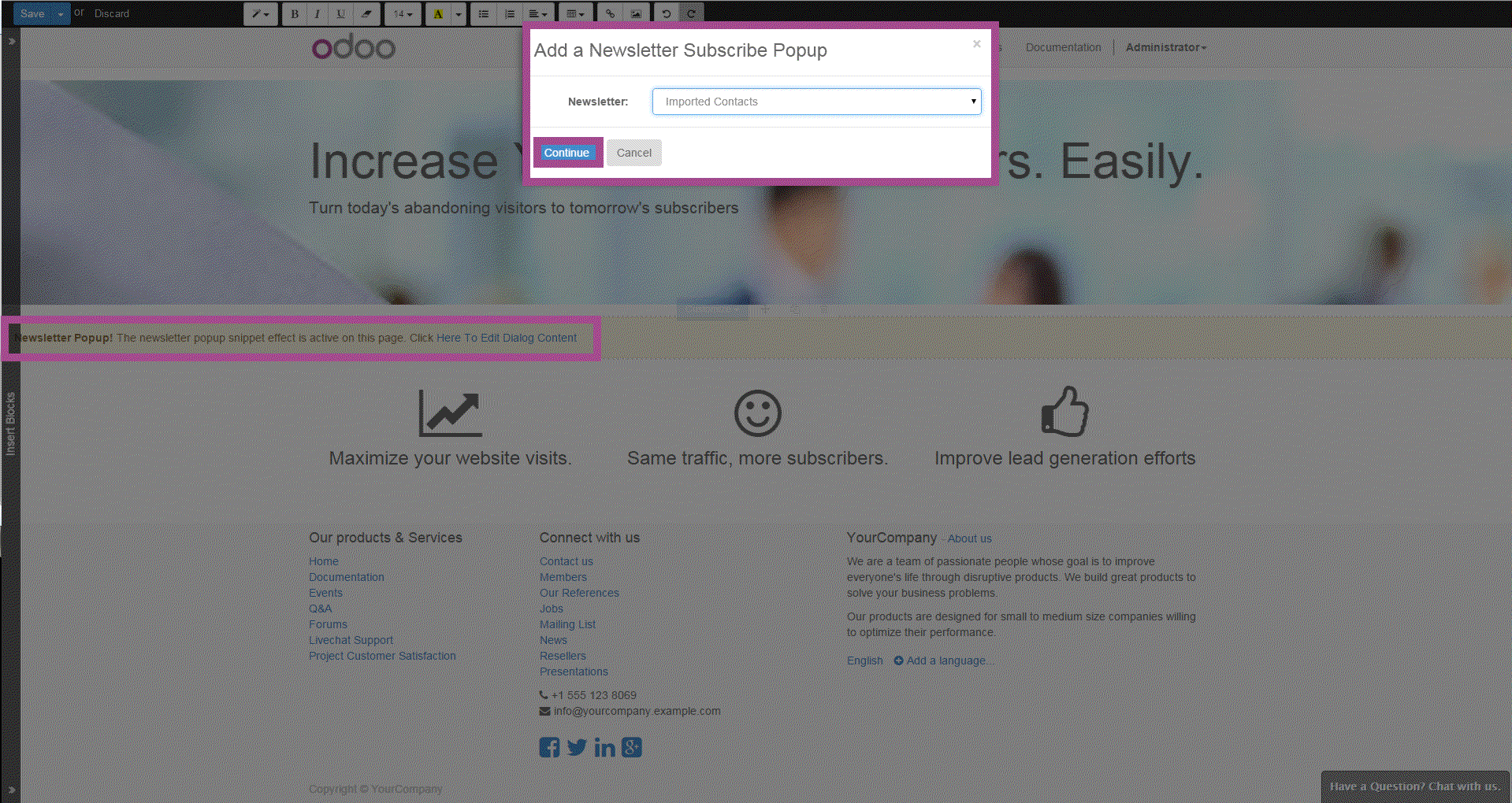 5. Cửa sổ bản tin Odoo Newsletter Popup của bạn đã sẵn sàng!