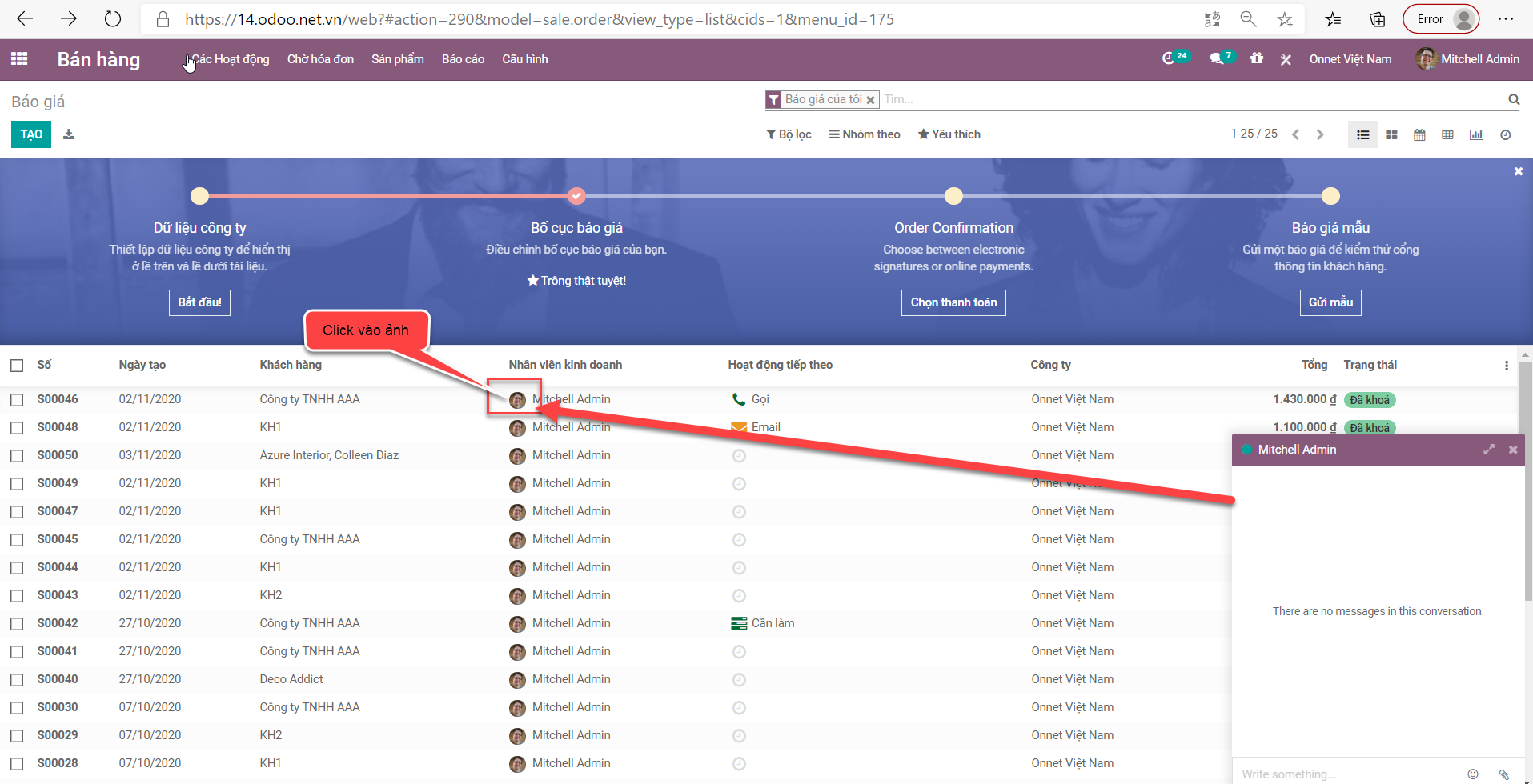 Các hoạt động cần thiết cho một đơn báo giá cũng được hiển thị ra ngoài danh sách đơn hàng
