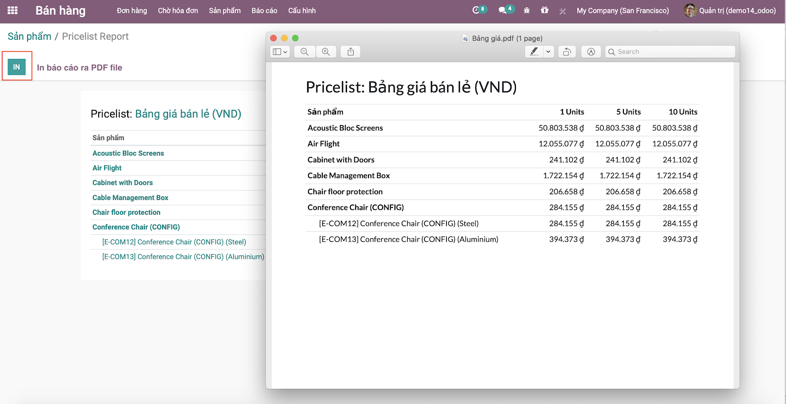 +) Odoo 14 cung cấp cho người dùng tuỳ chọn in bảng giá từ chính danh sách sản phẩm. Tại đây người dùng cũng có thể lựa chọn in bảng giá theo các loại tiền tệ khác nhau nếu người dùng có các loại bảng giá đa tiền tệ