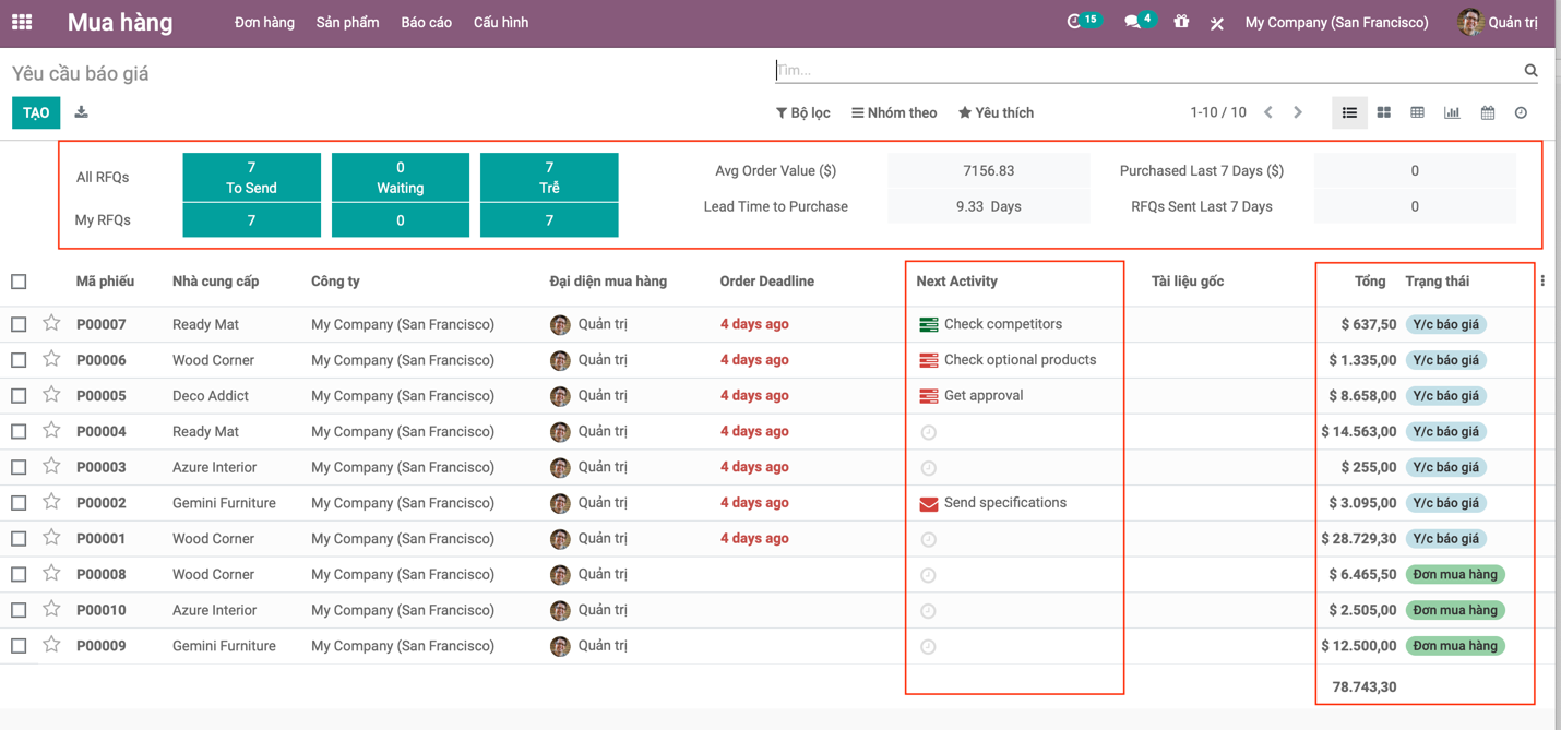Các trạng thái của yêu cầu báo giá cũng được Odoo thêm màu sắc để người dùng dễ dàng phân biệt hơn.