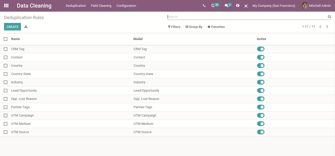 Data Cleaning là một trong những mô-đun mới đã được thêm vào phiên bản Odoo 14 Enterprise , đảm bảo loại bỏ dữ liệu trùng lặp để giảm dư thừa dữ liệu. Ứng dụng dọn dẹp dữ liệu là mô-đun mới được thiết kế để quét tất cả các tài liệu và dữ liệu không cần thiết khỏi bộ nhớ máy tính. Ứng dụng dọn dẹp dữ liệu hoạt động như một công cụ phân loại tất cả các tài liệu và tìm ra sự trùng lặp. Dữ liệu trùng lặp có thể dễ dàng được xóa khỏi hệ thống với sự trợ giúp của ứng dụng.