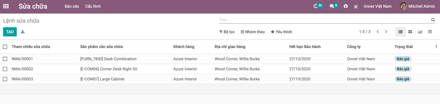 Có rất nhiều trường hợp mà có thể tạo ra một sản phẩm bị lỗi trong quá trình sản xuất, vì vậy các doanh nghiệp sản xuất cần quản lý sửa chữa. Hiểu được nhu cầu này, Odoo Enterprise cung cấp mô dun quản lý sửa chữa giúp người dùng lưu lại và lập kế hoạch cho tất cả các sửa chữa trên sản phẩm.