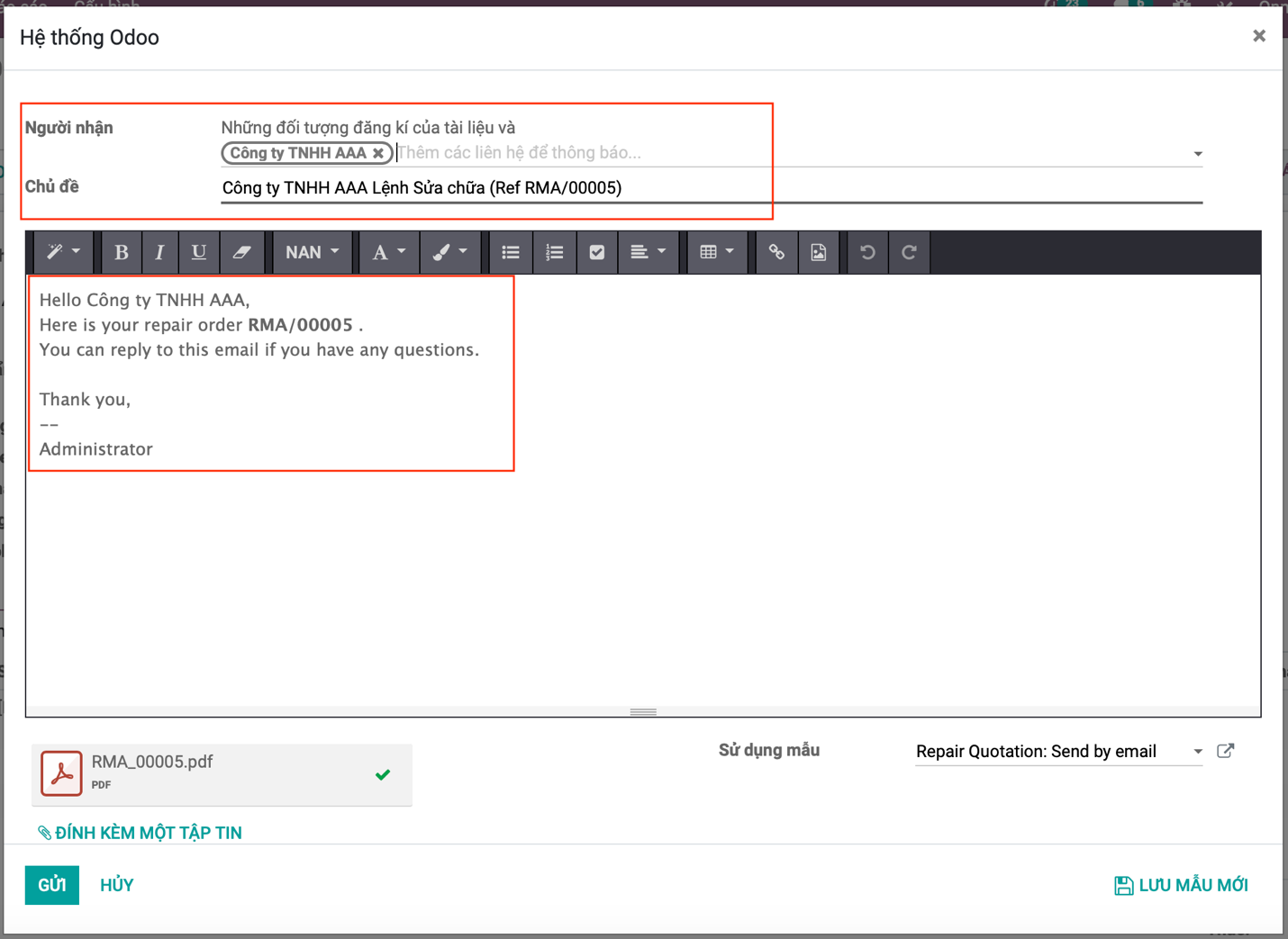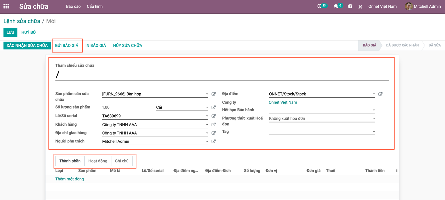 Bây giờ chúng ta sẽ tạo một đơn sửa chữa mới. Người dùng cần cung cấp chi tiết của sản phẩm và số lượng. Người cũng có thể chỉ định nhân viên sẽ giải quyết vấn đề này. Odoo cung cấp tính năng giúp người dùng có thể thực hiện một số phân tích cơ bản như ước tính linh kiện và thời gian cần để sửa sản phẩm đó. Hai tab thành phần và hoạt động sẽ cho phép người dùng thực hiện việc này. Ngoài ra, người dùng cũng có thể điền thêm ghi chú cho đơn sửa chữa.