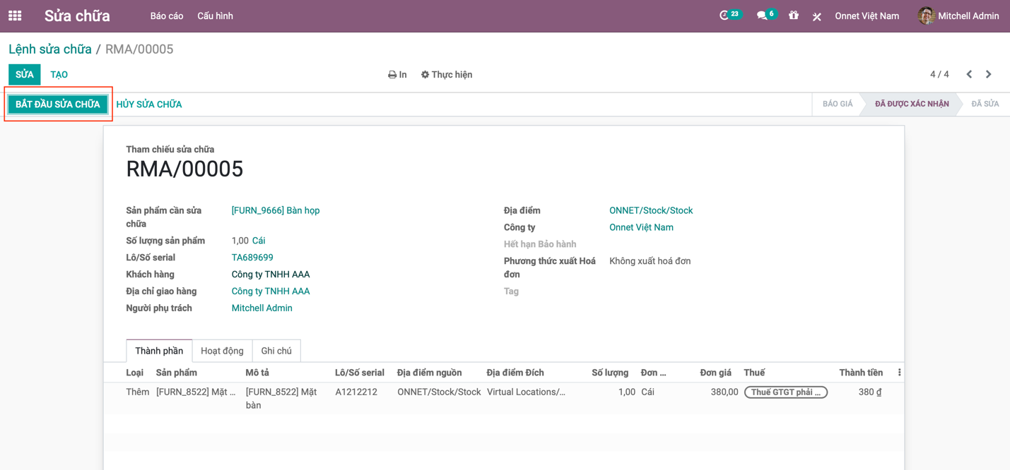 Khi nhận được sự đồng ý của khách hàng, người dùng có thể bắt đầu sửa chữa sản phẩm bằng cách nhấn vào “Bắt đầu sửa chữa” trên bảng điều khiển của đơn sửa chữa.