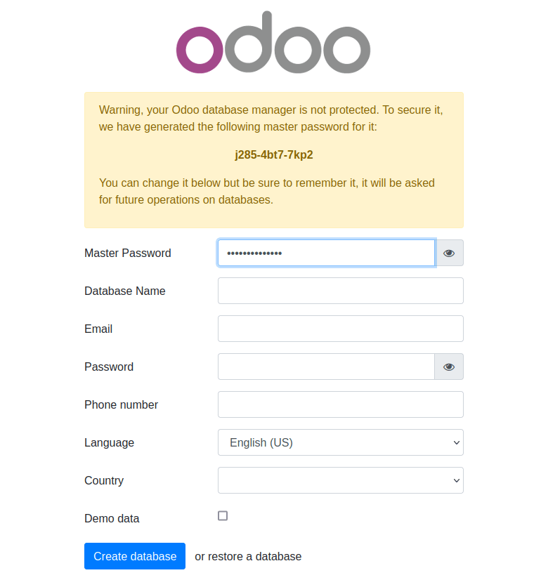 Nếu tất cả cấu hình của bạn thành công, trình duyệt sẽ điều hướng đến trình quản lý cơ sở dữ liệu của Odoo như hình dưới đây: