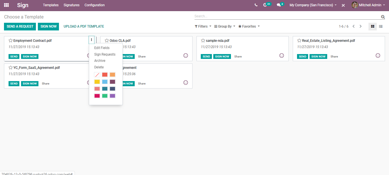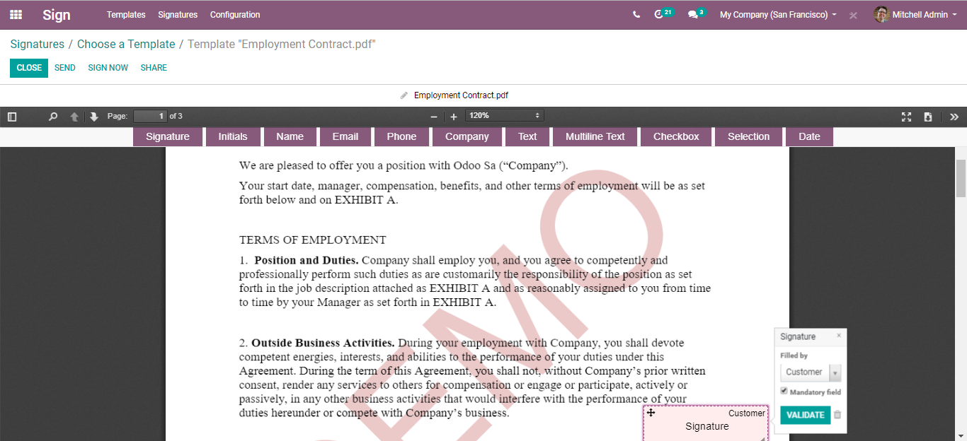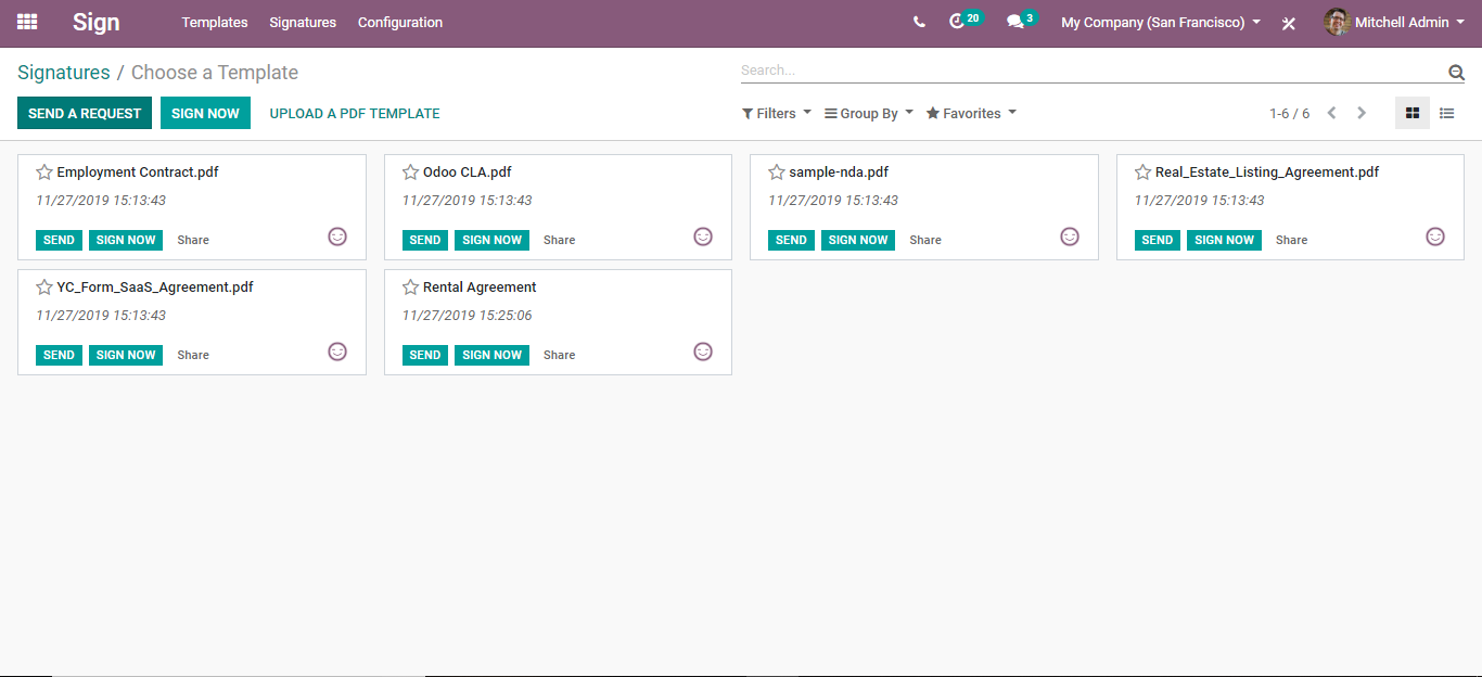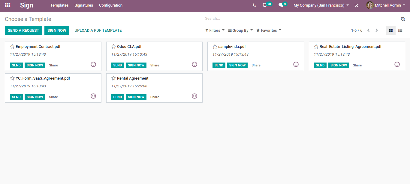 Với module chữ ký điện tử Odoo, người ta có thể dễ dàng gửi, ký và phê duyệt tài liệu trực tuyến. Từ việc tải lên tệp PDF của bạn đến kéo và thả các trường, mô-đun có cánh chào hàng đặc biệt của riêng nó. Odoo Sign là một chế độ nhanh chóng và thuận tiện để được ký và phê duyệt các tài liệu.