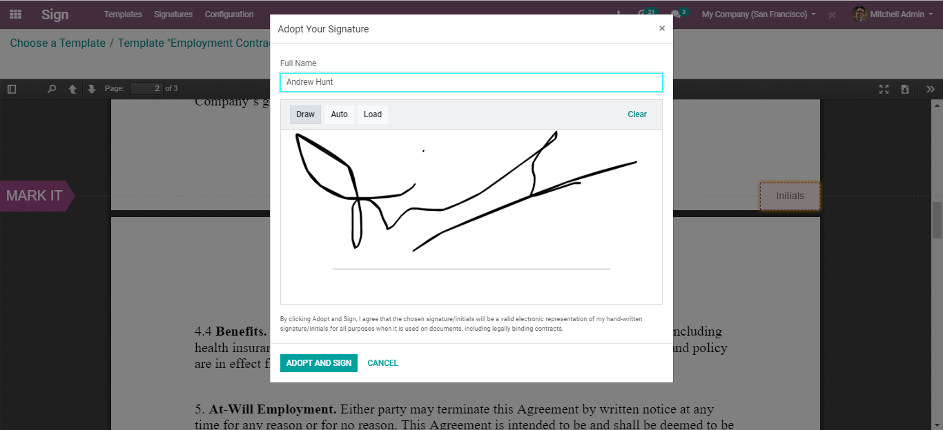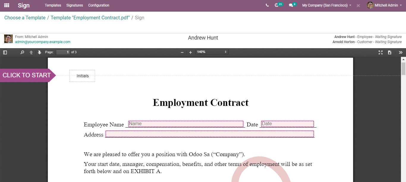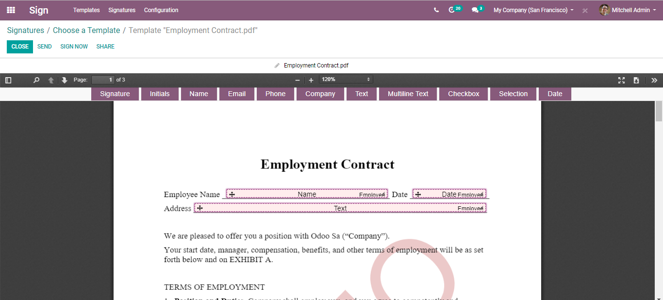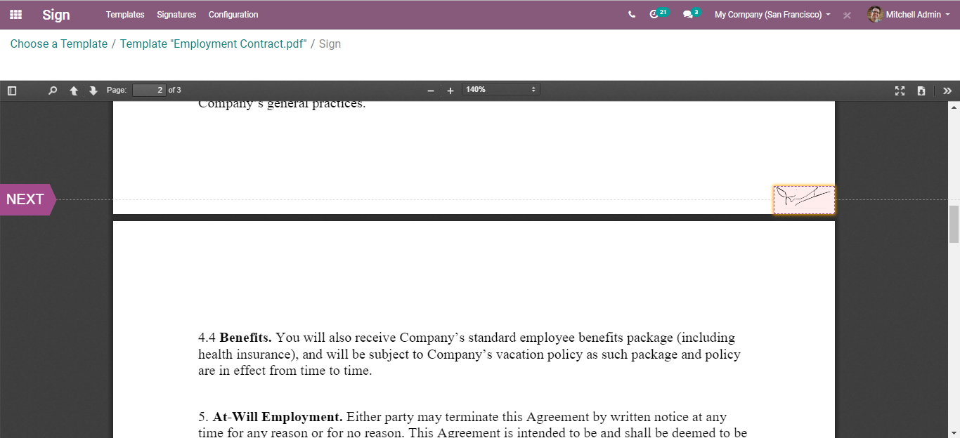 Với module chữ ký điện tử Odoo, người ta có thể dễ dàng gửi, ký và phê duyệt tài liệu trực tuyến. Từ việc tải lên tệp PDF của bạn đến kéo và thả các trường, mô-đun có cánh chào hàng đặc biệt của riêng nó. Odoo Sign là một chế độ nhanh chóng và thuận tiện để được ký và phê duyệt các tài liệu.