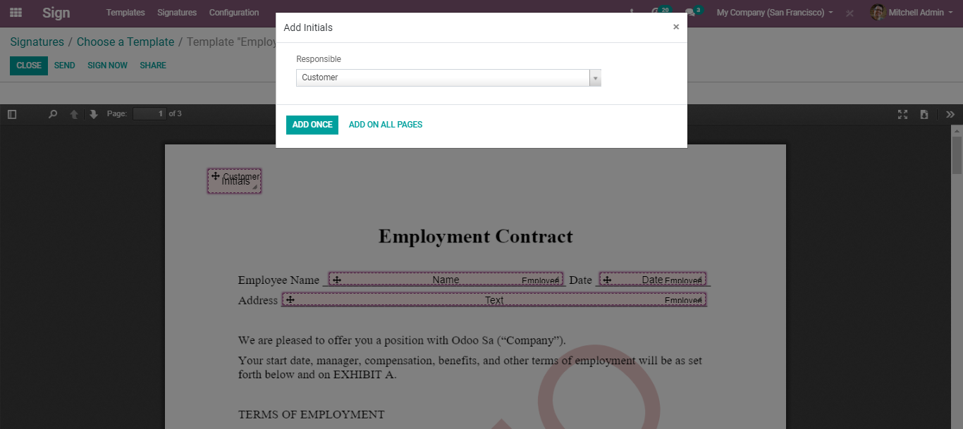 Bạn có thể thấy ở đây trách nhiệm là khách hàng. Người ta có thể thêm tên viết tắt vào trang này một mình bằng cách nhấp vào tùy chọn ADD ONCE và tên viết tắt cho tất cả các trang bằng cách nhấp vào tùy chọn THÊM TẤT CẢ CÁC TRANG. Nếu bạn được yêu cầu chữ ký cho tài liệu này, bạn có thể chọn CHỮ KÝ từ trên xuống,