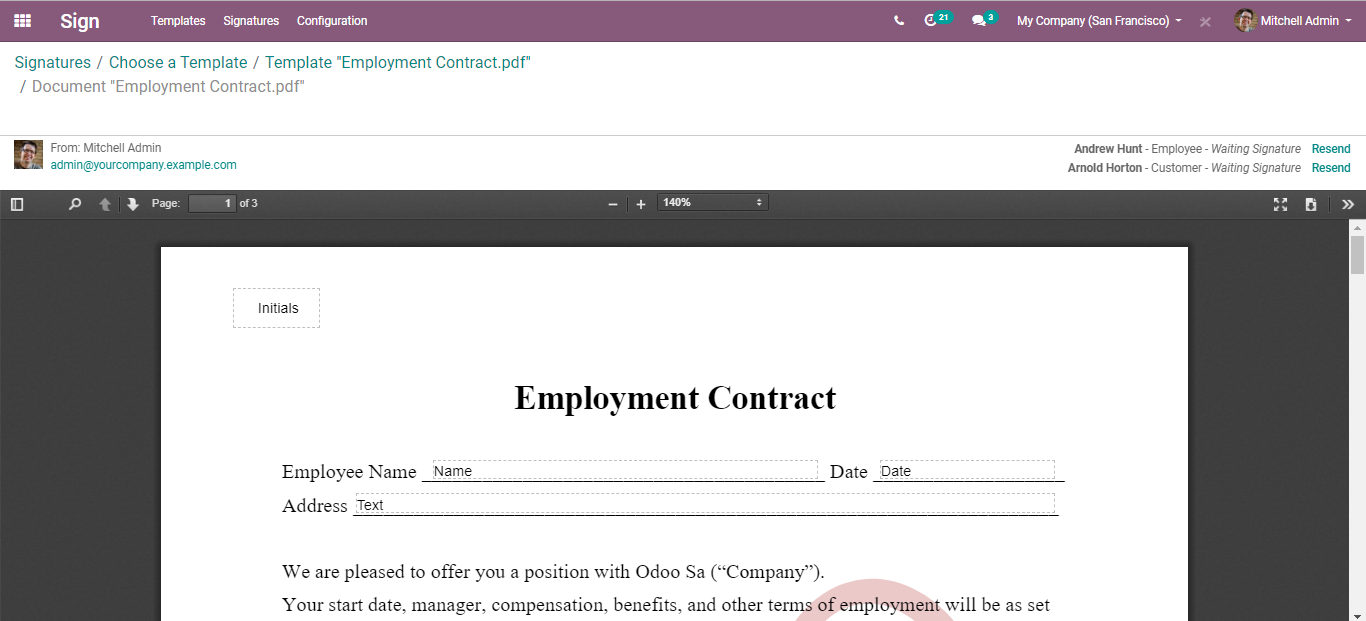 Một lần nữa bạn có thể xem trước tài liệu với chữ ký đang chờ từ nhân viên và khách hàng. Thông qua việc nhấp vào nút RESEND, người ta có thể gửi email đến một người cụ thể.