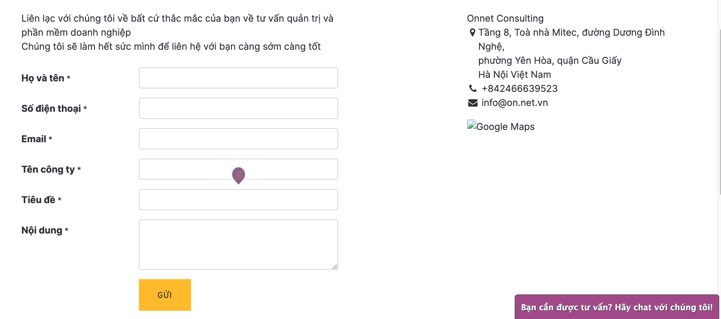 Với ứng dụng CRM được cài đặt, bạn được hưởng lợi từ biểu mẫu liên hệ sẵn sàng sử dụng trên trang web Odoo, biểu mẫu này sẽ tự động tạo khách hàng tiềm năng / cơ hội.