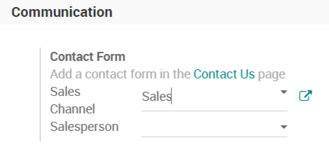 Để thay đổi sang một kênh bán hàng cụ thể, hãy chuyển đến Trang web -> Cấu hình -> Cài đặt trong Liên lạc, bạn sẽ tìm thấy thông tin Biểu mẫu liên hệ và nơi thay đổi Kênh bán hàng hoặc Nhân viên bán hàng.