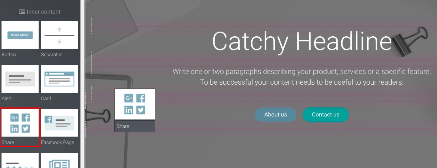 Thả khối thiết kết web "Chia sẻ" trên bất kỳ trang nào bạn muốn khách truy cập chia sẻ lên mạng xã hội. Bằng cách nhấp vào biểu tượng, họ được nhắc chia sẻ trang trên các trang mạng xã hội cá nhân của họ.