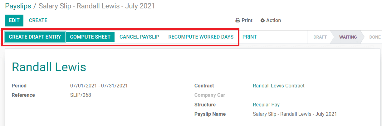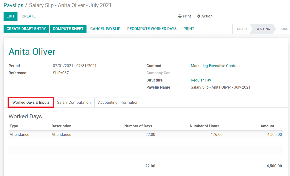 Có các thao tác khác được phép trong phiếu lương này như nếu bạn muốn tính toán trang tính, bạn có thể chọn nút 'Tính toán trang tính'. Cũng có thể đếm lại số ngày làm việc bằng cách sử dụng 'Tính lại số ngày làm việc'. Nhấp vào ‘Cancel Payslip’ để hủy phiếu của nhân viên.