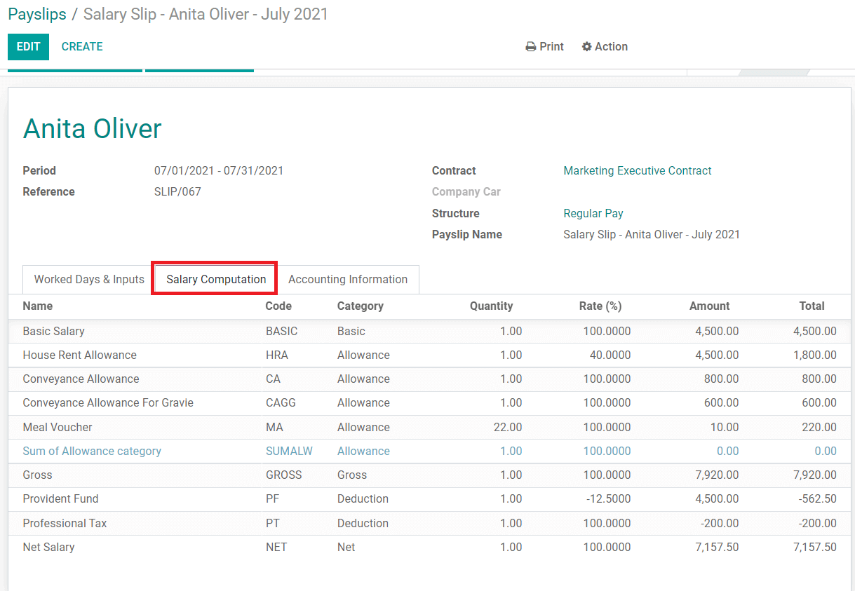 Sử dụng nút ‘Tạo’ ’, chúng tôi có thể thêm thông tin chi tiết về nhân viên mới và hợp đồng của họ. Tại đây, chọn một nhân viên và bạn có thể xem chi tiết hợp đồng đính kèm trong hồ sơ của họ.