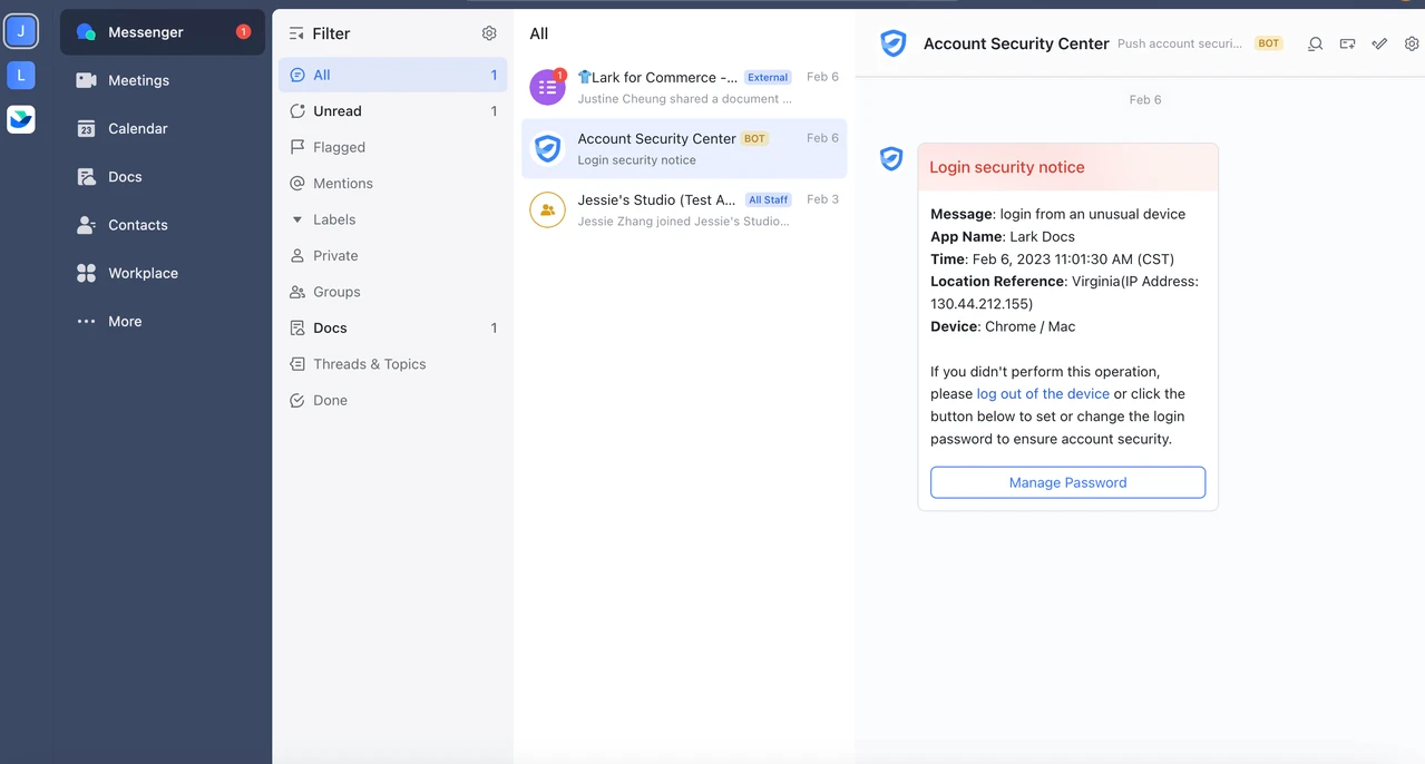 Vì vậy, Lark xây dựng các chức năng họp, lịch, tài liệu, nhiệm vụ, ứng dụng không mã và email trên nền tảng để khách hàng dễ dàng truy cập và kích hoạt nhanh chóng, bên cạnh các chức năng trò chuyện được kết nối với các chức năng khác để làm cho chính chức năng trò chuyện càng mạnh mẽ hơn. Bạn không cần phải tích hợp nào để chuyển một tin nhắn thành một nhiệm vụ trên danh sách nhiệm vụ của mình, hoặc lên lịch các cuộc họp trực tiếp từ các cuộc trò chuyện nhóm, hoặc phê duyệt yêu cầu nghỉ phép bằng cách nhấp vào nút trên thẻ thông báo được gửi đến bạn.