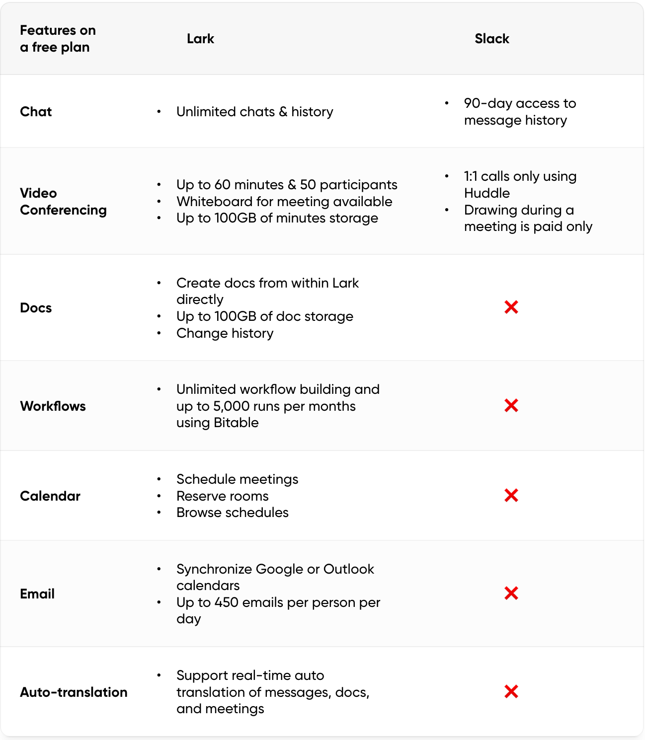 Tổng quan, Lark có thể thay thế hầu hết các chức năng và tích hợp của Slack; nó có thể được sử dụng bởi các công ty từ nhiều ngành công nghiệp khác nhau với các công cụ cho công việc hàng ngày trong một ứng dụng với giá cả thấp hơn, thời gian đào tạo ngắn hơn và giao diện thân thiện trên các màn hình lớn và nhỏ.