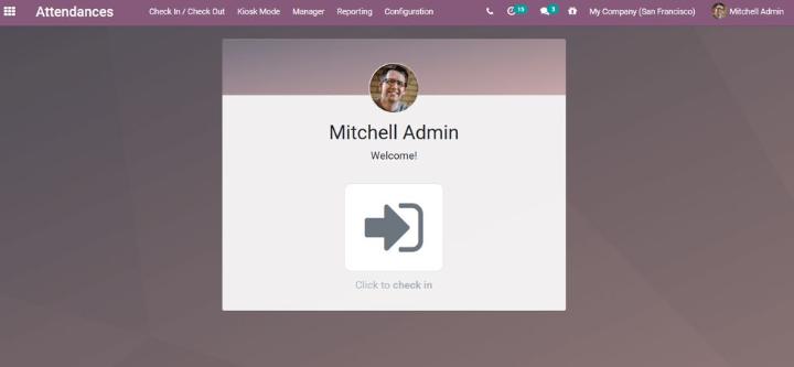 Mô-đun chấm công Odoo 14 có thể được cài đặt từ các ứng dụng Odoo. Ứng dụng đã cài đặt khi được mở sẽ chuyển hướng đến cửa sổ đăng nhập/đăng xuất. Chúng ta có thể truy cập vào ứng dụng bằng mũi tên đăng nhập/đăng xuất trên màn hình. Chúng ta có thể kích hoạt mã pin hoặc mã vạch để nhân viên ghi lại sự chấm công của họ vào hệ thống.