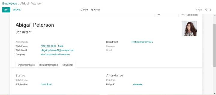 Người quản lý có tùy chọn để truy cập cả chi tiết nhân viên và chi tiết chấm công. Trong danh sách (menu) nhân viên từ người quản lý, bạn có thể kéo xuống để đến cửa sổ nhân viên đã được tạo trong công ty. Trong cài đặt nhân sự (HR Settings), có một tùy chọn để cung cấp vị trí công việc. Chúng ta có thể chỉnh sửa chi tiết nhân viên bao gồm mã PIN và thẻ ID (badge ID) sau khi kích hoạt mã PIN nhân viên trong cấu hình. Thẻ ID có thể được tạo từ cùng một cửa sổ bằng cách sử dụng tùy chọn tạo.
