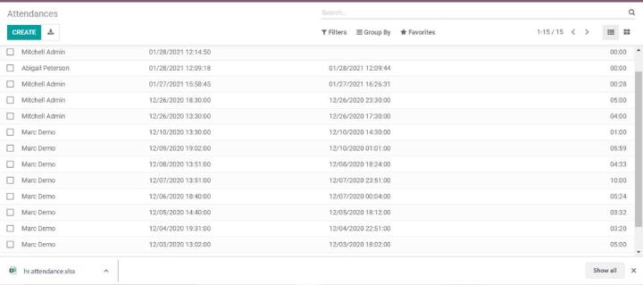 Chúng ta có thể có cái nhìn tổng quát về việc chấm công của các nhân viên từ danh sách (menu) chấm công trong trình quản lý. Các chi tiết sẽ được hiển thị dưới dạng dữ liệu bảng và có thể thay thế cho bảng kanban.