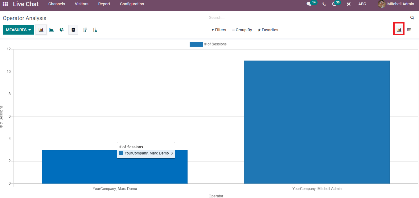 Người dùng có thể phân tích Lịch sử phiên, Đánh giá của khách hàng và Thống kê phiên thông qua nền tảng Trò chuyện trực tiếp Odoo 15. Để làm được điều này, hãy nhấp vào tab Báo cáo trong trang tổng quan và bạn có thể phân tích tất cả các chi tiết đã cho ở trên.