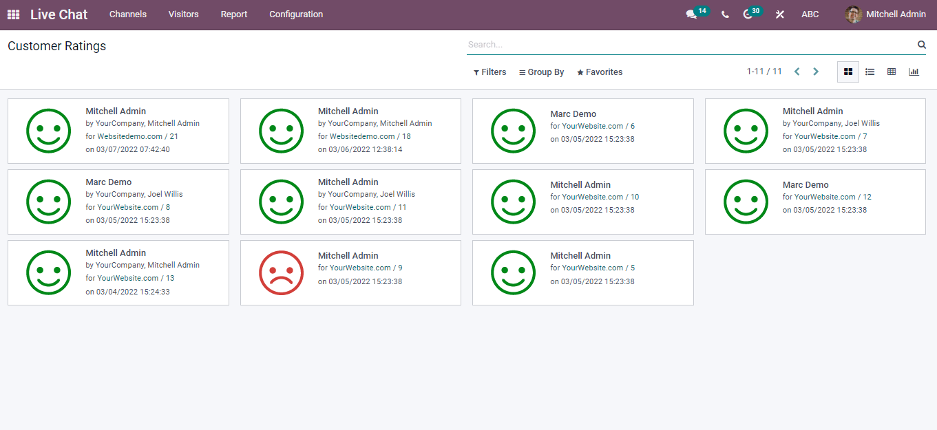 Khách truy cập có thể đánh giá trang web dựa trên phản hồi của bạn. Bạn có thể truy cập Đánh giá của khách hàng bằng bảng điều khiển Trò chuyện trực tiếp của Odoo 15. Trong trang Đánh giá của khách hàng, chúng ta có thể biết về thông tin liên quan đến khách hàng, ngày, giờ đã gửi, nhà điều hành xếp hạng và xếp hạng được mô tả trong ảnh chụp màn hình bên dưới.