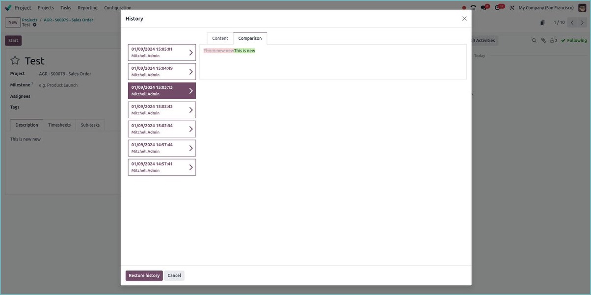 Bạn có thể theo dõi các thay đổi trong mô tả nhiệm vụ và quay lại các phiên bản trước đó trong Odoo 18.
