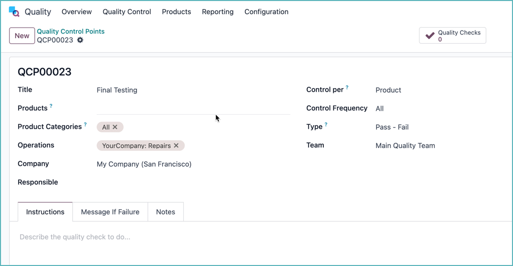 Odoo đã thêm kiểm soát chất lượng vào các quy trình sửa chữa. Nâng cấp này đảm bảo rằng việc kiểm soát chất lượng cũng được áp dụng cho các công việc sửa chữa, cung cấp một cách hệ thống để duy trì các tiêu chuẩn.