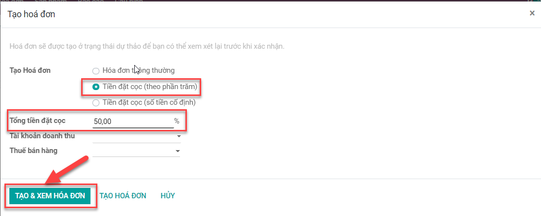 Bước 3: Chọn để tạo hóa đơn theo nhu cầu của người dùng. Trong trường hợp trả trước, người dùng có thể sử dụng hai tùy chọn. Đó là điền vào một số tiền cố định hoặc tỷ lệ phần trăm cố định. Cả hai đều được sử dụng trong các doanh nghiệp tuỳ theo các điều khoản và điều kiện thanh toán của họ.