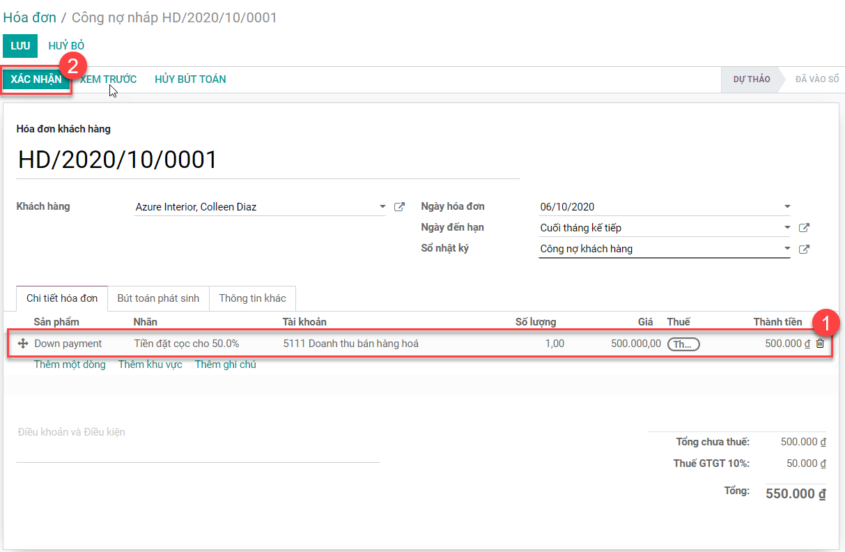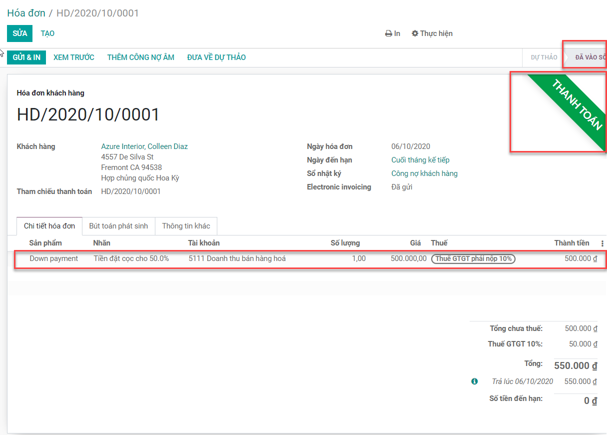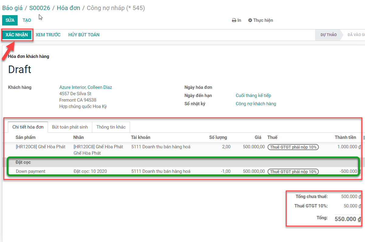 Tại hoá đơn, người dùng có thể kiểm tra được chi tiết khoản trả trước trong giai đoạn đầu đặt hàng. Để thực hiện việc nhận thanh toán trước khi giao hàng, người dùng cần xác nhận hoá đơn từ khách hàng bằng cách kiểm tra bút toán.