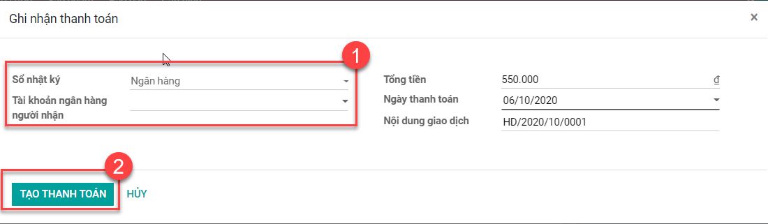 Nếu khách hàng thực hiện thanh toán bằng cách chuyển tiền vào tài khoản ngân hàng của công ty, người dùng có thể kiểm tra hóa đơn : Chọn Kế toán -> Khách hàng -> Hóa đơn -> Click vào button Ghi nhận thanh toán. Hệ thống hiển thị