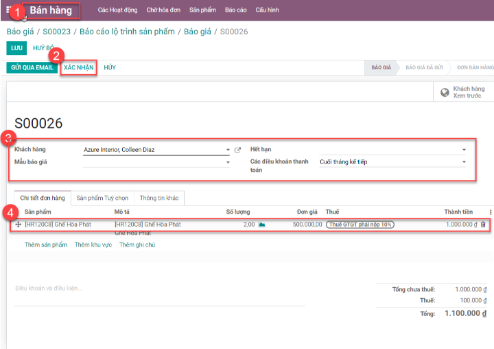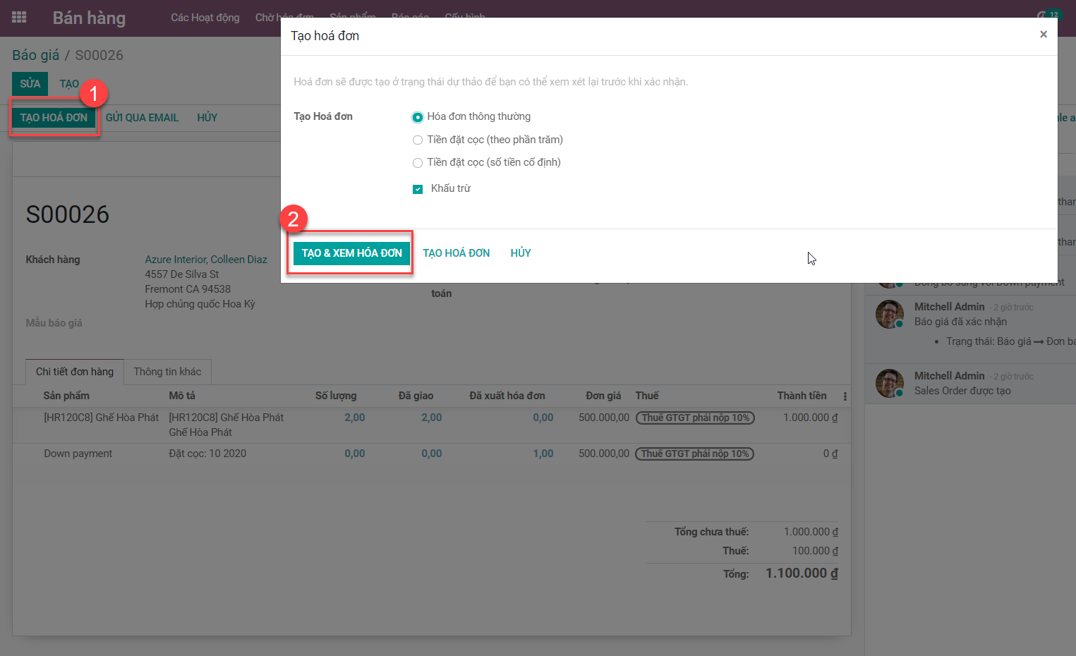 Bước 2: Xác nhận báo giá sau khi điền đầy đủ thông tin chi tiết. Sau khi báo giá chuyển sang trạng thái Đơn bán hàng, hệ thống hiển thị button Tạo hóa đơn