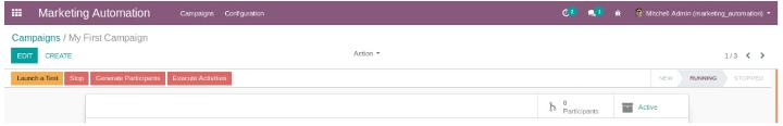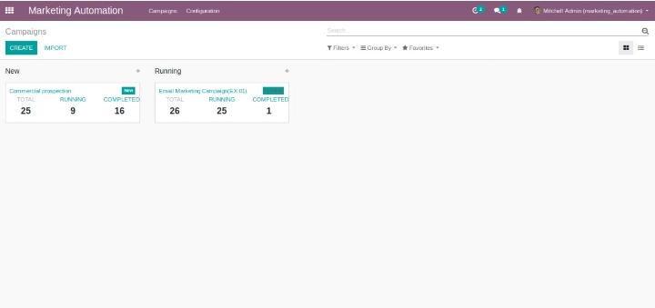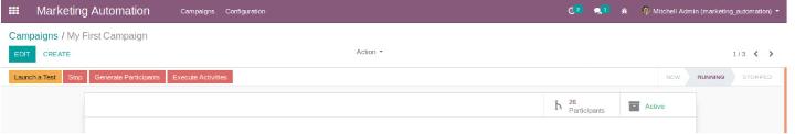 Bằng cách nhấp vào biểu tượng, ứng dụng Odoo Marketing Automation sẽ dẫn đến một trang hiển thị các chiến dịch đã tạo, trạng thái của nó, các tùy chọn để tạo và cấu hình các chiến dịch mới.