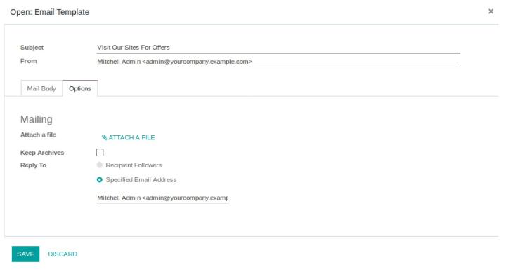 Bằng cách nhấp vào nút liên kết trên trường chọn mẫu email, người ta có thể tạo và cấu hình mẫu email.
