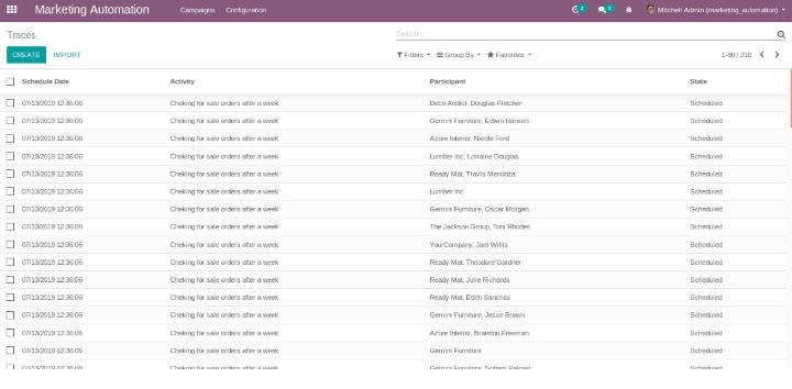 Odoo Marketing Automation tạo ra các chiến dịch tiếp thị tự động và nhắm mục tiêu. Tính năng này giúp tự động hóa các quy trình công việc và từ đó mở rộng quy mô kinh doanh. Ứng dụng giúp đơn giản hóa các hoạt động của khách hàng từ đầu đến cuối, thiết kế các chiến dịch email hấp dẫn và các mẫu email cần thiết. Để có thể kích hoạt bất kỳ hành động nào trong Marketing Automation thì đều đòi hỏi sự hợp lý của quy trình nghiệp vụ.