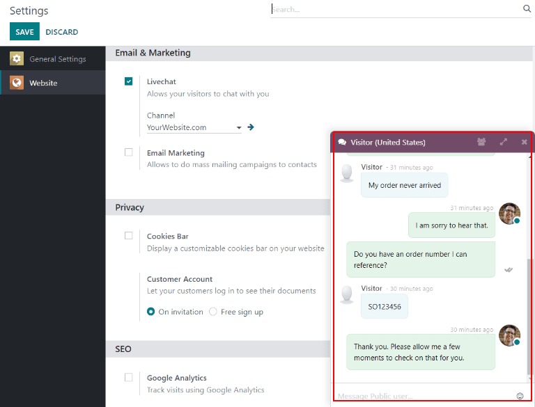 - Trò chuyện trực tiếp có thể được truy cập từ bất kỳ mô-đun nào, trên front-end và back-end, để theo dõi từng cuộc trò chuyện.