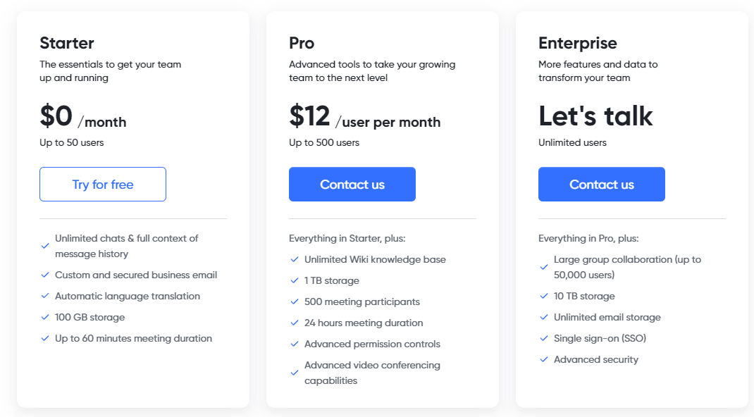 Về giá cả, Lark cung cấp phiên bản miễn phí bao gồm các tính năng cơ bản như nhắn tin, cuộc gọi âm thanh và video cũng như chỉnh sửa tài liệu trực tuyến. Tuy nhiên, đối với các tính năng nâng cao như lưu trữ đám mây, hội nghị truyền hình cho các nhóm lớn hơn và kiểm soát quản trị nâng cao, Lark cung cấp các gói trả phí người dùng mỗi tháng.