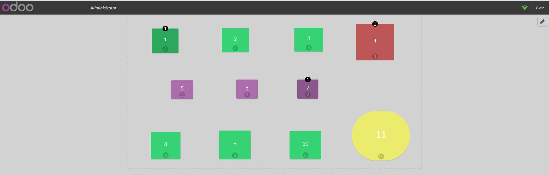 Vẽ bố cục nhà hàng của bạn vào Odoo POS, chọn số bàn (màu trắng), số ghế (khoanh tròn) và thậm chí cả hình dạng của bàn. Tất cả đều được dựng vừa vặn vào màn hình máy tính bảng và không có vấn đề trùng lặp.