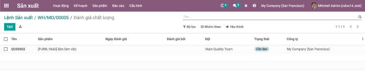 Khi tạo đơn hàng sản xuất cho sản phẩm Bàn họp trong mô đun sản xuất, người dùng sẽ nhìn thấy biểu tượng kiểm tra chất lượng nhằm mô tả các kiểm tra chất lượng cần được thực hiện cho sản phẩm này trong và sau khi sản xuất.