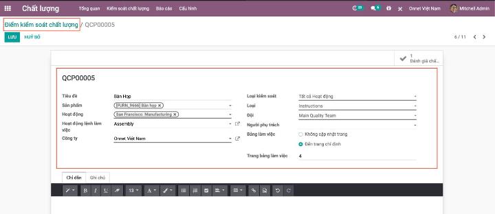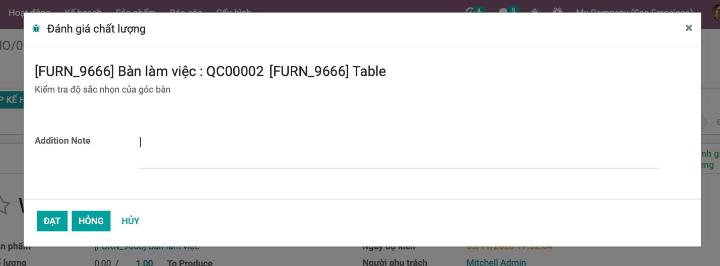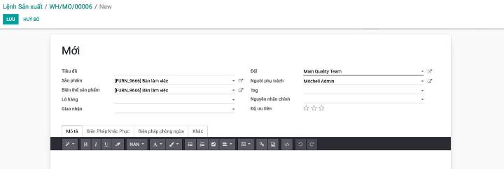 Người dùng sẽ cần phải kích hoạt tính năng đánh giá chất lượng cho sản phẩm mà mình sẽ sản xuất. Như bạn thấy thì hình bên dưới mô tả việc đánh giá chất lượng cần được thực hiện cho sản phẩm “Bàn làm việc”. Người dùng đã yêu cầu nhân viên kiểm tra về độ sắc nhọn của góc bàn