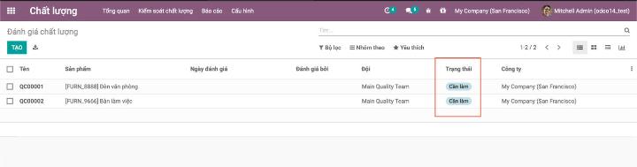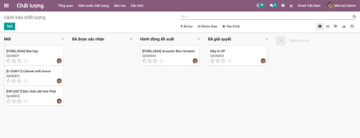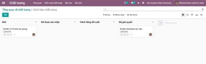 Người dùng có thể kiểm tra các cảnh báo chất lượng tại bảng điều khiển của mô đun chất lượng và các hoạt động để biết rằng trạng thái của các trạng thái của các hoạt động kiểm tra chất lượng như mới, đã được xác nhận, hành động đề xuất và đã giải quyết. Người dùng cũng có thể tuỳ chỉnh như thêm hoặc sửa tên các trạng thái để phù hợp với hoạt động doanh nghiệp. Hình ảnh dưới đây sẽ mô tả bảng điều khiển chất lượng trên Odoo 14