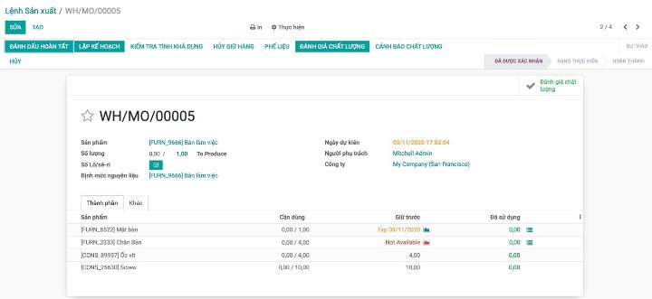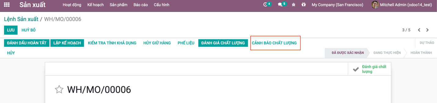 Sau khi tạo ra cảnh báo chất lượng, chúng ta sẽ kiểm tra xem cảnh báo đó được thực hiện như thế nào bằng cách tạo ra một đơn sản xuất