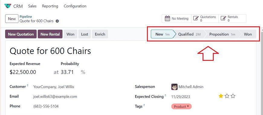 Với việc Odoo 17 bổ sung tính năng này, người dùng có thể xác định hoặc theo dõi thời gian đã dành cho mỗi giai đoạn của một dự án, hoạt động, công việc, vv. Từ biểu mẫu cấu hình, thời gian này sẽ được hiển thị bên trong thanh trạng thái pipeline, như minh họa dưới đây.