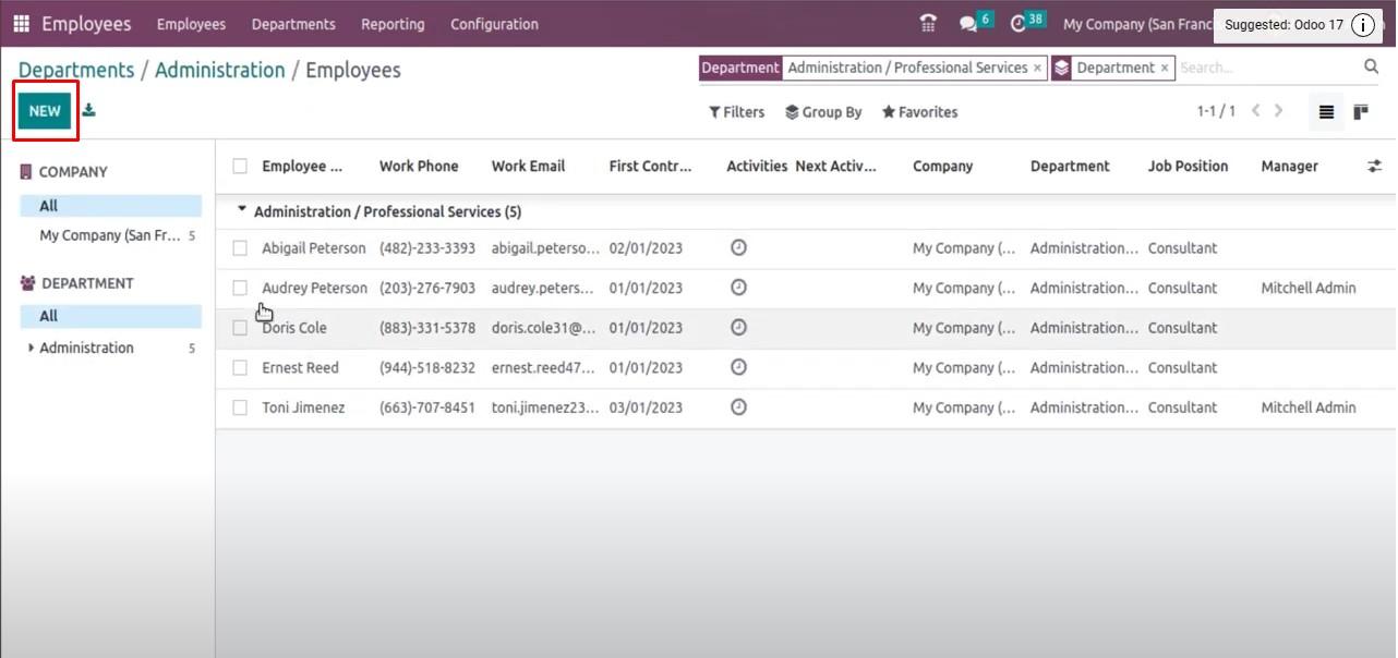 Nút "Create" được đổi tên thành “New”.  Tuy nhiên, nó được thực hiện trên phiên bản Odoo 16.