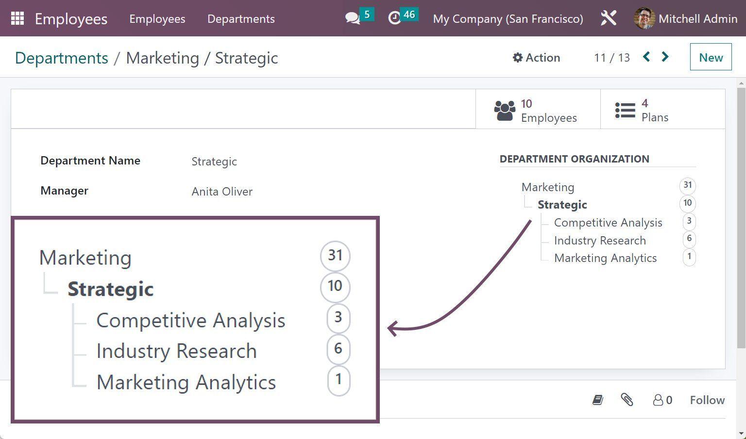 Odoo 17 cải thiện hơn về giao diện, cấu trúc sơ đồ tổ chức. Cho người dùng thấy rõ hơn mối quan hệ giữa các thành viên trong tổ chức.