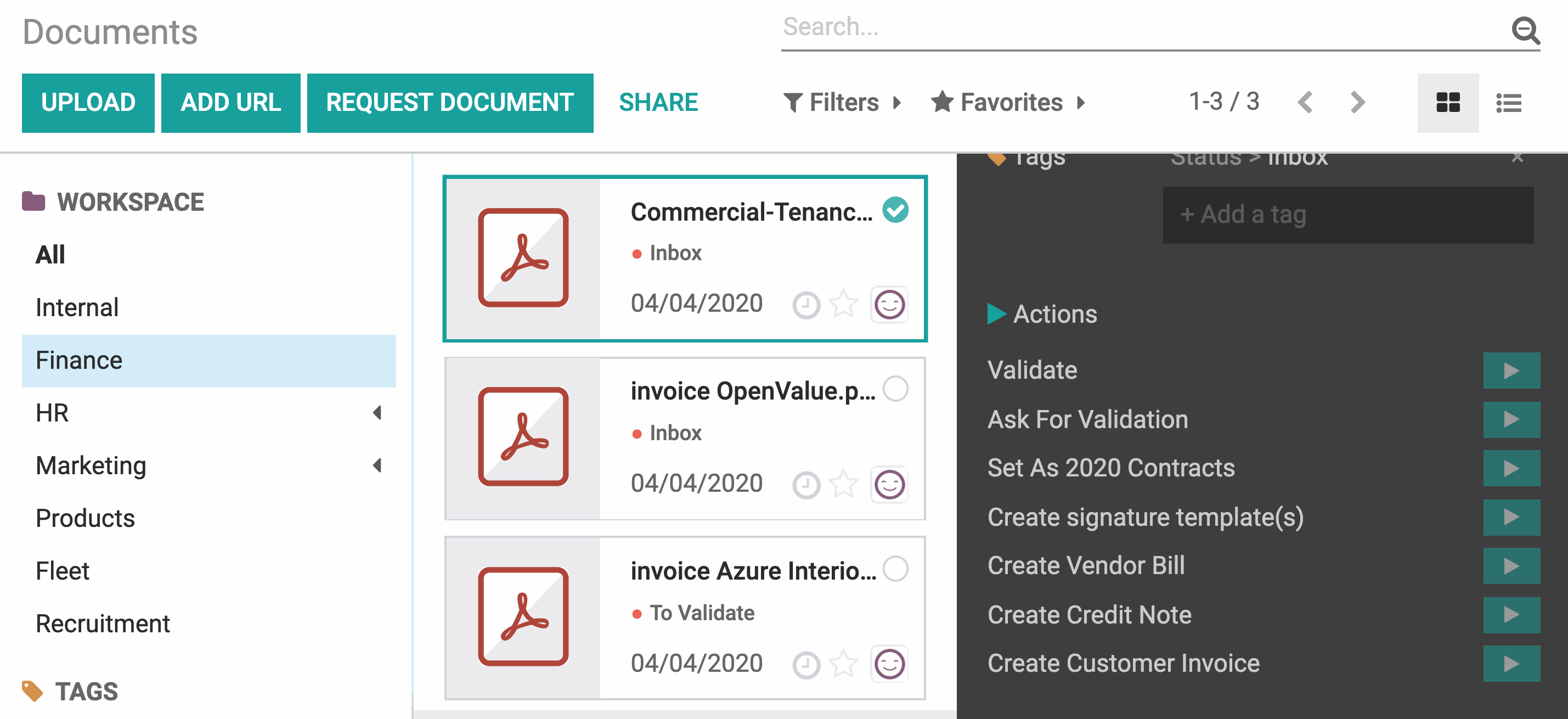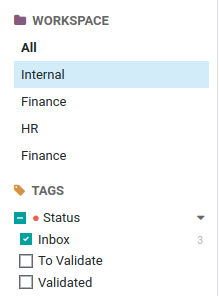 Để sắp xếp dòng tài liệu đầu vào, chúng tôi dùng ứng dụng Documents của Odoo. Ứng dụng này có tất cả công cụ mà chúng tôi cần để xử lý tài liệu theo lô: cổng email, thao tác thực hiện hàng loạt được định cấu hình trước, trình chia tách PDF, bản xem trước, v.v.